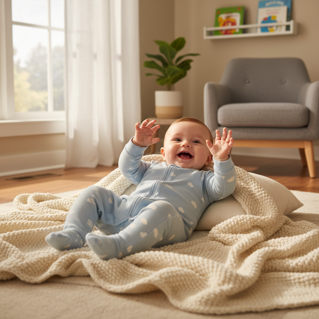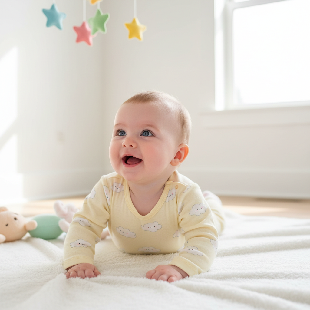Around 3-4 months, babies start to enjoy tummy time, showing off their growing strength.