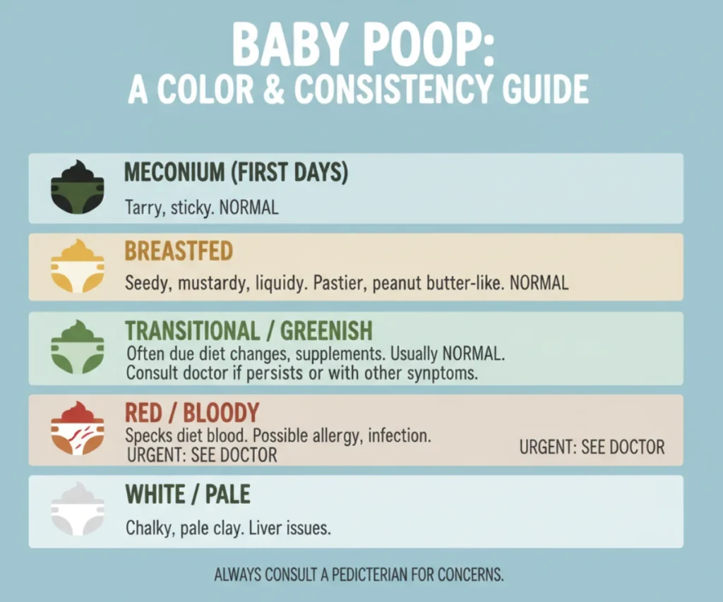 - Meconium: The very first poops, typically dark green or black and tar-like. This is normal and consists of materials ingested in the womb.