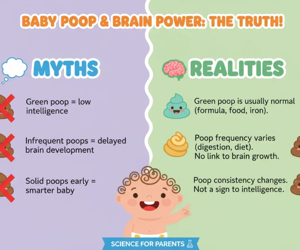 - Reality: Poop frequency varies widely among healthy babies. It reflects digestion speed, not brain speed.