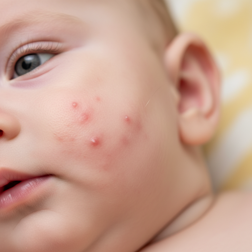 - Baby Acne Tiny red or white bumps, often on the face, caused by maternal hormones. Usually appears within the first few weeks and clears up without treatment.