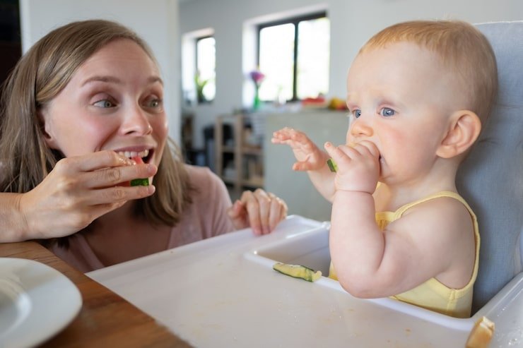 Sit together as a family when possible. Babies learn by watching you eat. Create a calm environment, avoid rushing, and make mealtimes enjoyable.