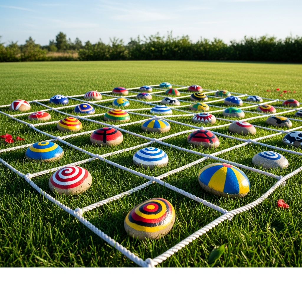 Scale up this classic tabletop game by creating a grid on the grass using rope or spray paint. Use painted stones or large wooden cutouts as the X and O markers. Because of its size, children have to move around to place their markers, making it a more active version of the logical puzzle. It is durable and can be left out for several days of play.