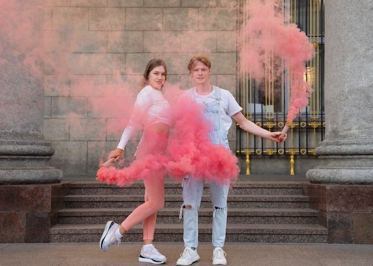 Use pink or blue powder or smoke bombs outdoors for a simple but stunning effect — perfect for pictures!