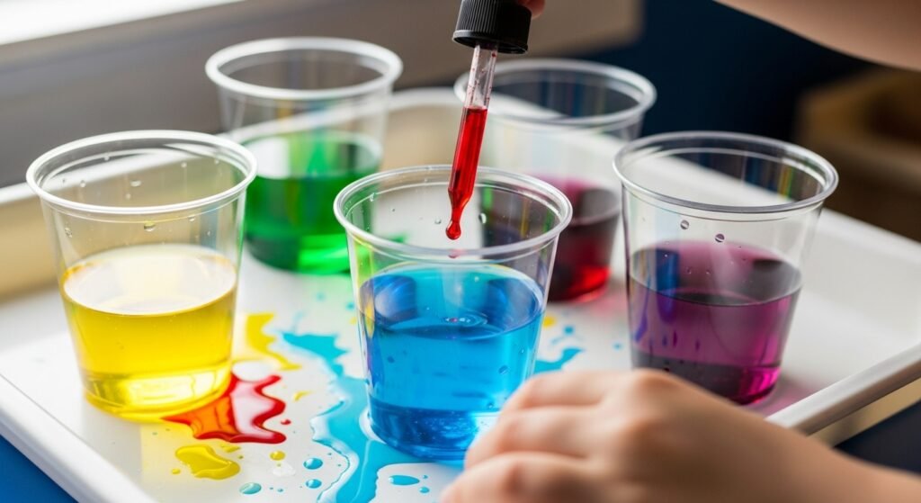 Give your child empty cups and let them mix colors to discover new shades.