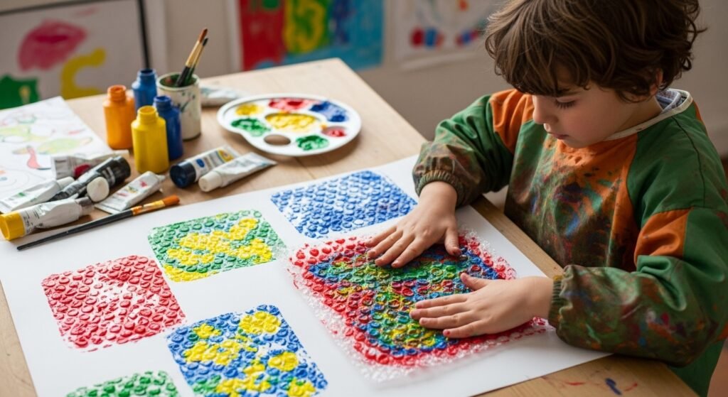 Paint bubble wrap with different colors and press paper onto it.