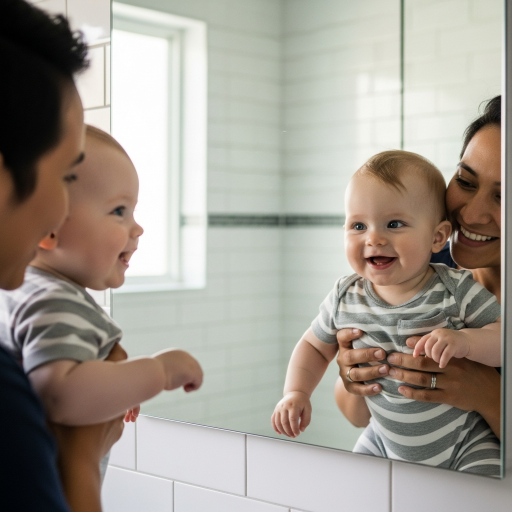 Hold your baby in front of a large mirror and point to their reflection. Name their features like nose and eyes to help develop self-awareness and facial recognition skills.