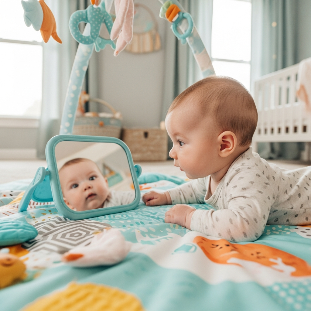 Tummy time is vital for developing neck and shoulder strength. Enhance this activity by placing a non-breakable mirror or colorful toys just out of reach to encourage reaching and neck movement.