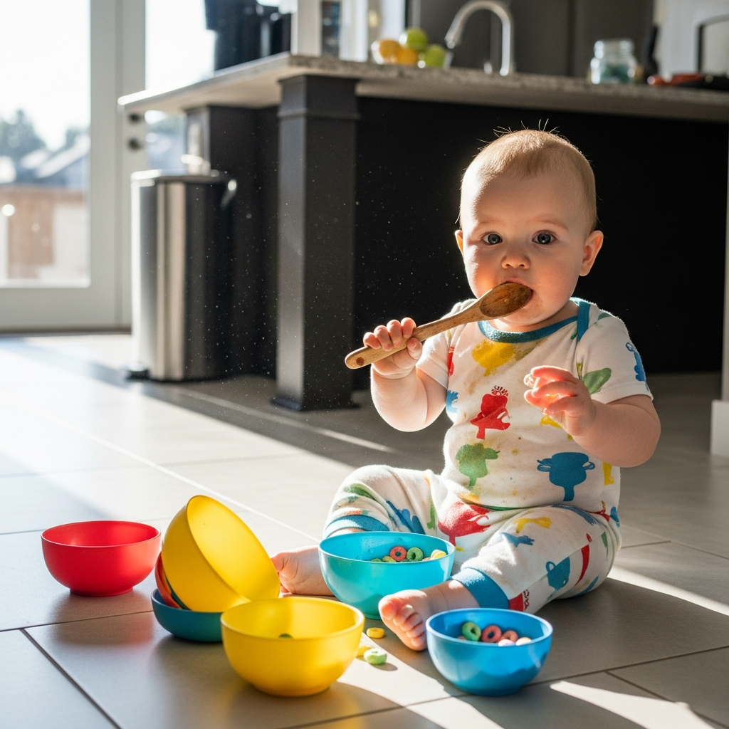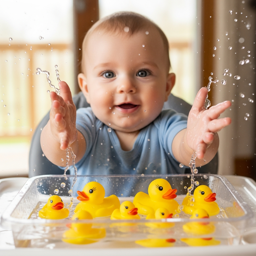 Place a shallow tray of water in front of a sitting baby. Adding floating toys or measuring cups allows them to explore the physics of splashing and pouring under close supervision.