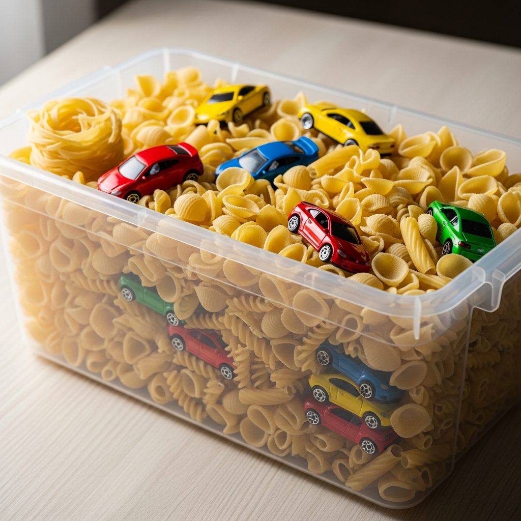 Fill a bin with safe materials like large pasta shapes or dry oats. Hide toys inside for your baby to find, stimulating their sense of touch and problem-solving abilities.