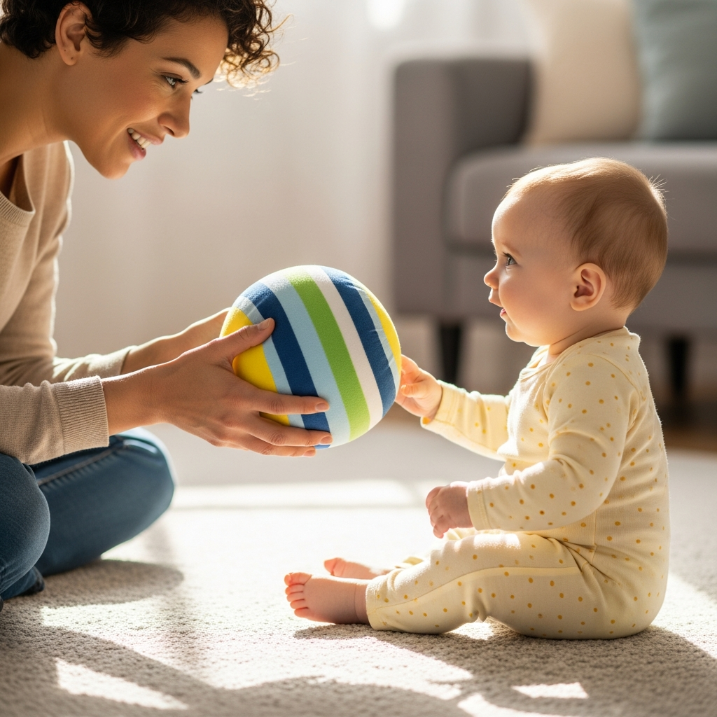 Sit across from your baby and roll a soft ball toward them. This simple back-and-forth movement builds social interaction skills and improves tracking of moving objects.