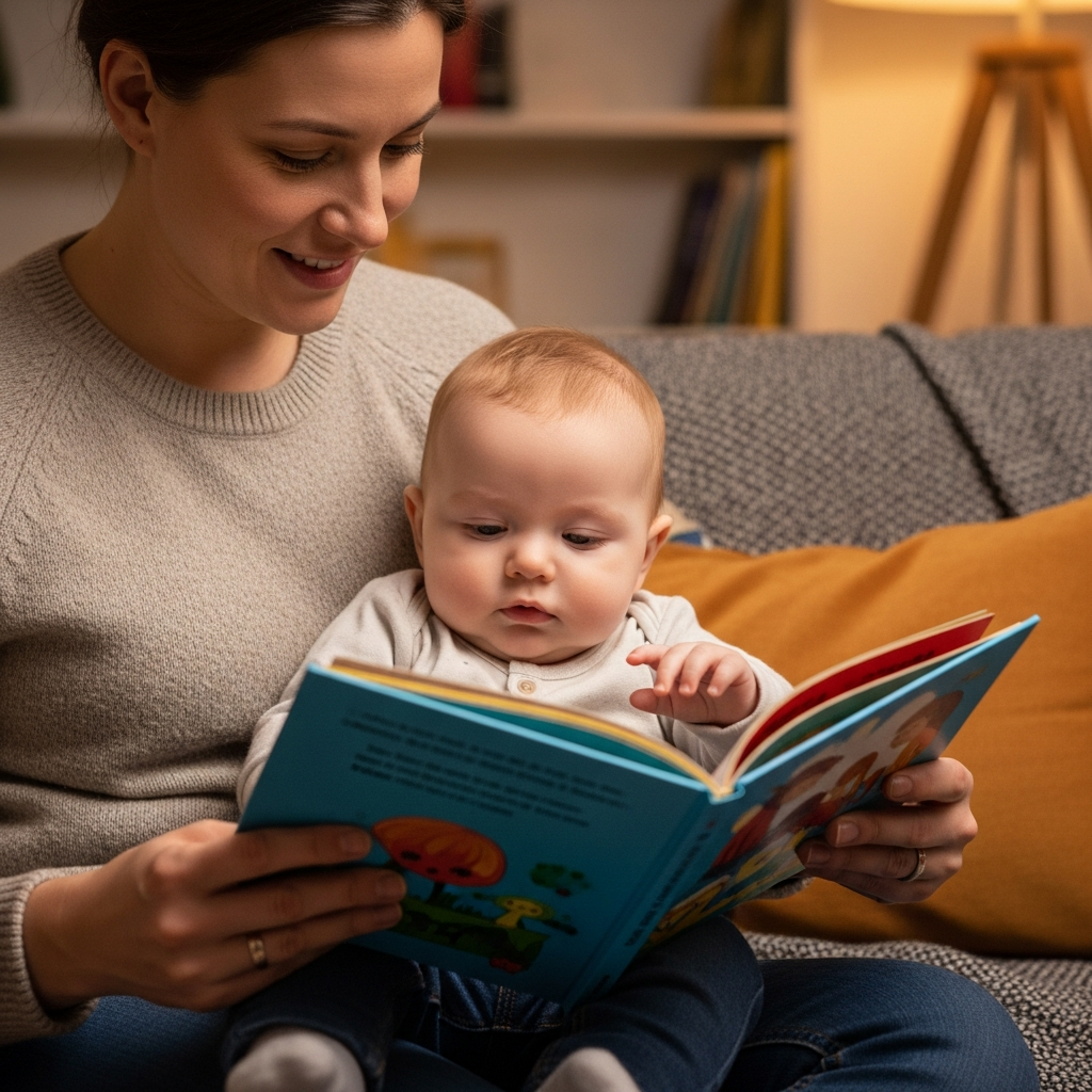 Reading aloud introduces language patterns and vocabulary. Use board books with bright illustrations and varying vocal tones to keep your baby engaged and curious.