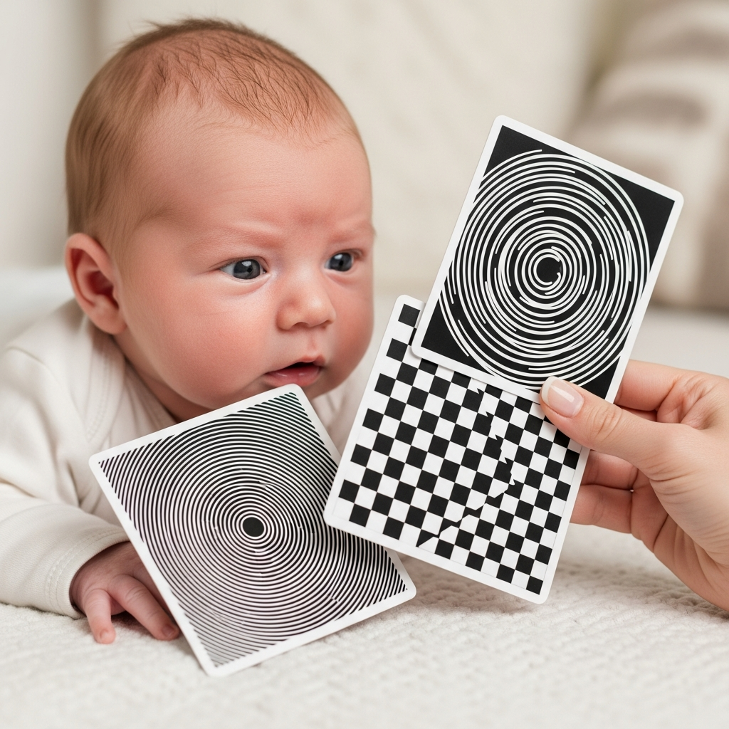 Newborns primarily see in high contrast. Use black and white cards with bold patterns to help stimulate their visual nerves and improve focus during the first few months.