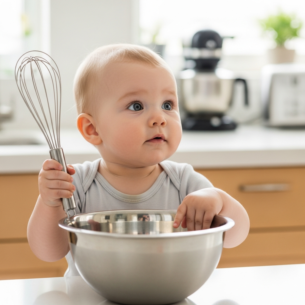 Hand your baby a whisk or a metal bowl. Exploring different sounds made by various kitchen utensils encourages curiosity and auditory processing.