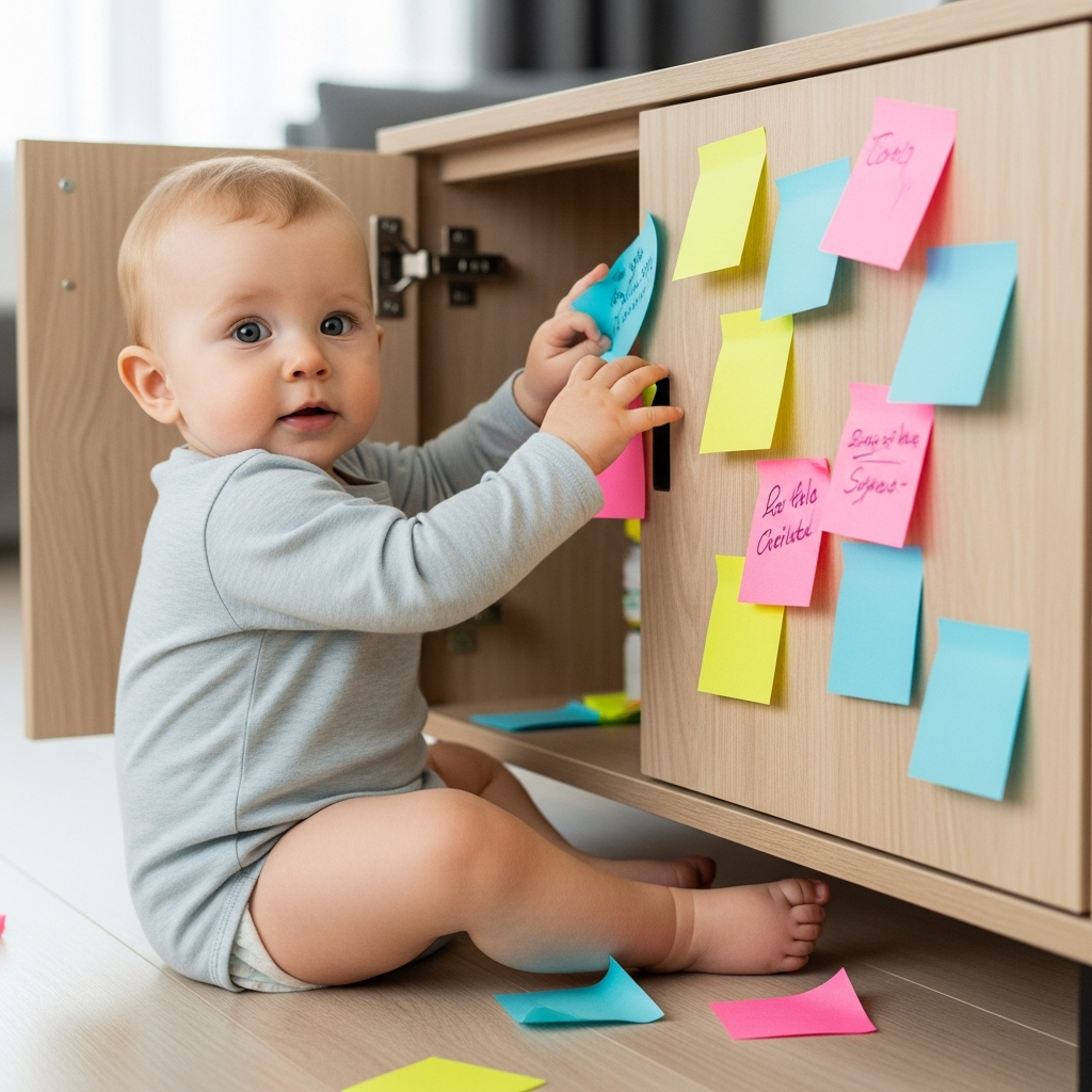 Place colorful sticky notes on a wall or floor within your baby’s reach. Peeling them off is an excellent way to practice the pincer grasp and fine motor control.