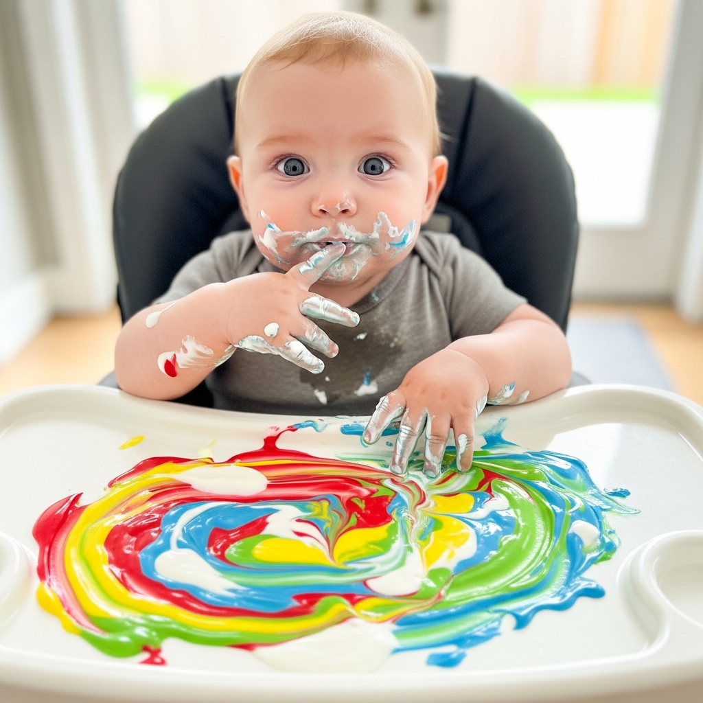 Create a safe paint using yogurt and food coloring. Let your baby express their creativity on a high-chair tray, providing a safe sensory and artistic experience.