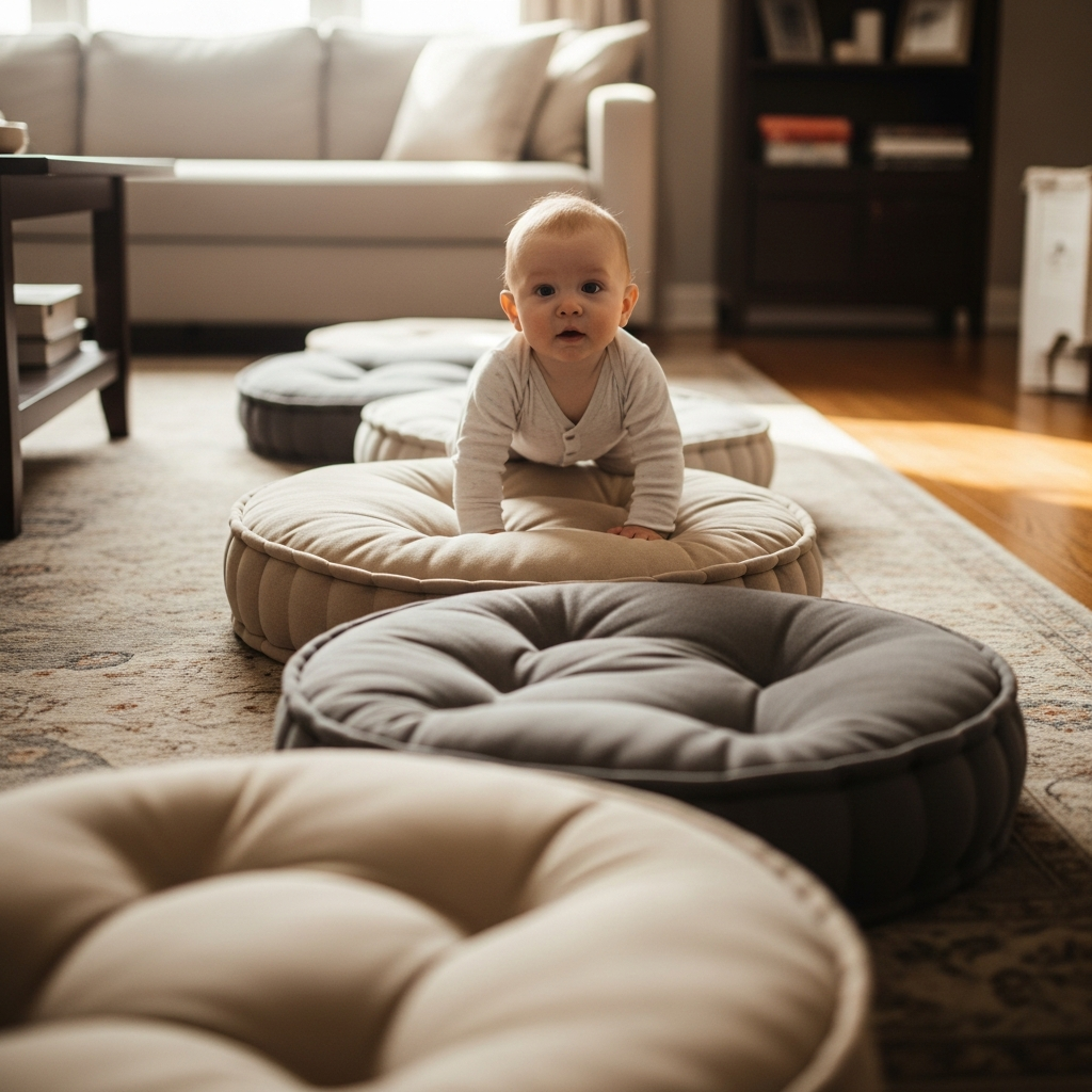 Arrange sofa cushions on the floor for crawling babies. Navigating over and around these soft obstacles builds gross motor strength and spatial awareness.
