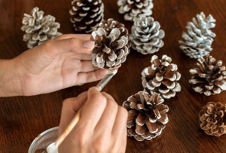 Collect pinecones from outside, paint them with white tips for a snowy effect, and add a ribbon for hanging. Natural, simple, and beautiful.