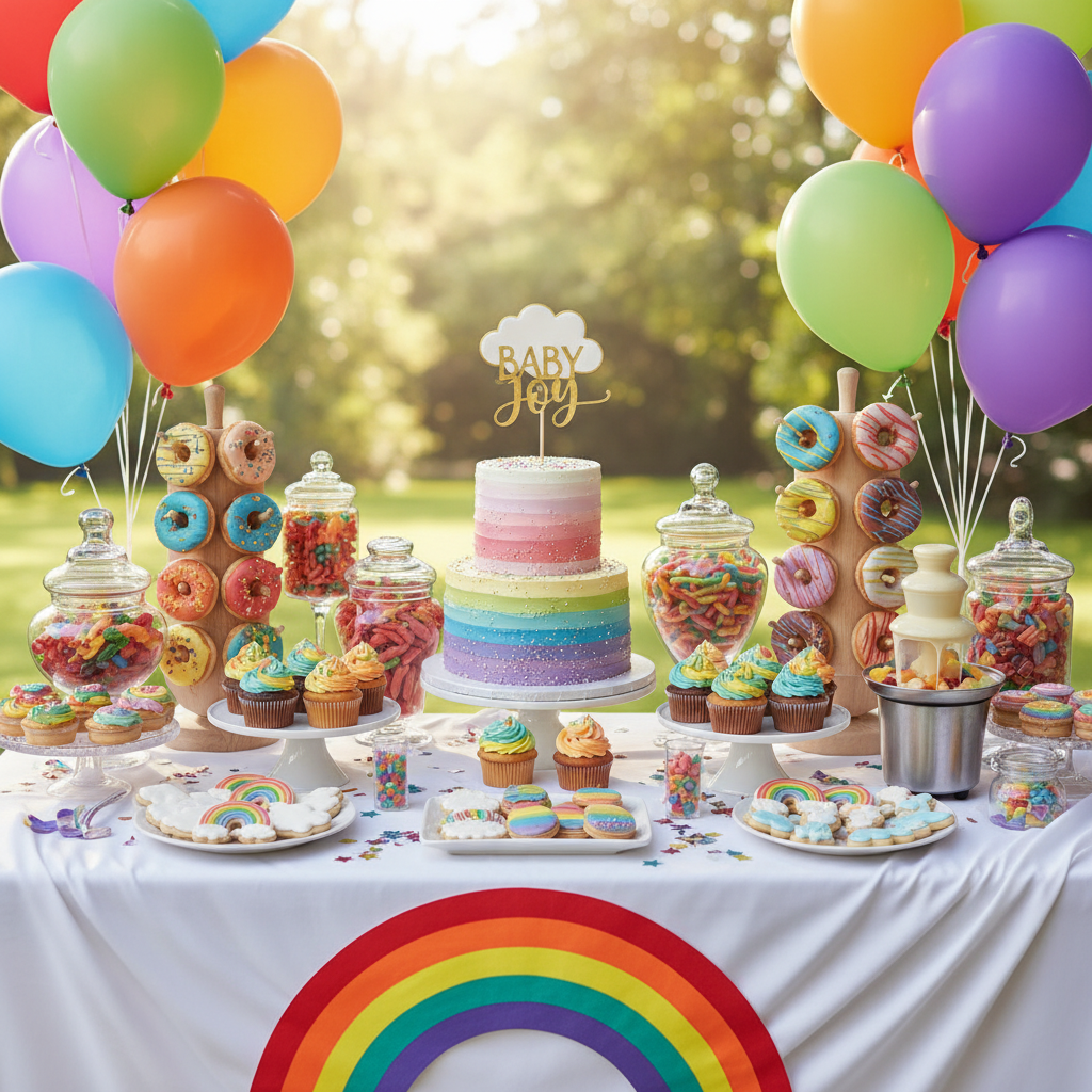 Embrace vibrant colors and positivity with a sunshine and rainbows theme. This theme is naturally gender-neutral and brings an instant smile to everyone’s face. Use bright streamers, colorful balloons, and rainbow-themed treats.