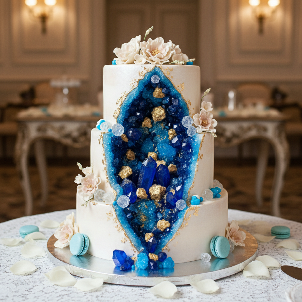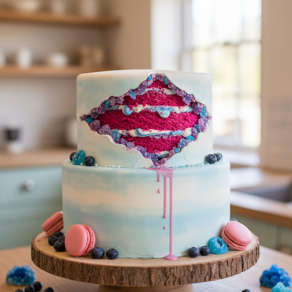 A stunning and modern option, the geode cake features edible crystals embedded into the cake, often in shades of pink or blue. It’s an artistic masterpiece that doubles as a gender reveal.