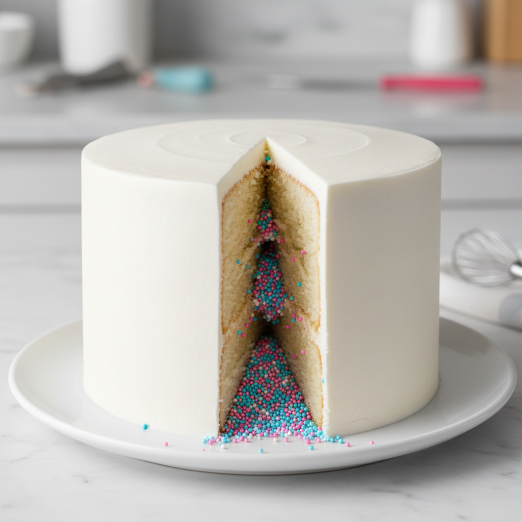 For a minimalist yet exciting reveal, opt for a simple white cake. The surprise comes when you cut it open, and a cascade of pink or blue sprinkles tumbles out from a hollowed-out center. It’s unexpected and incredibly photogenic.