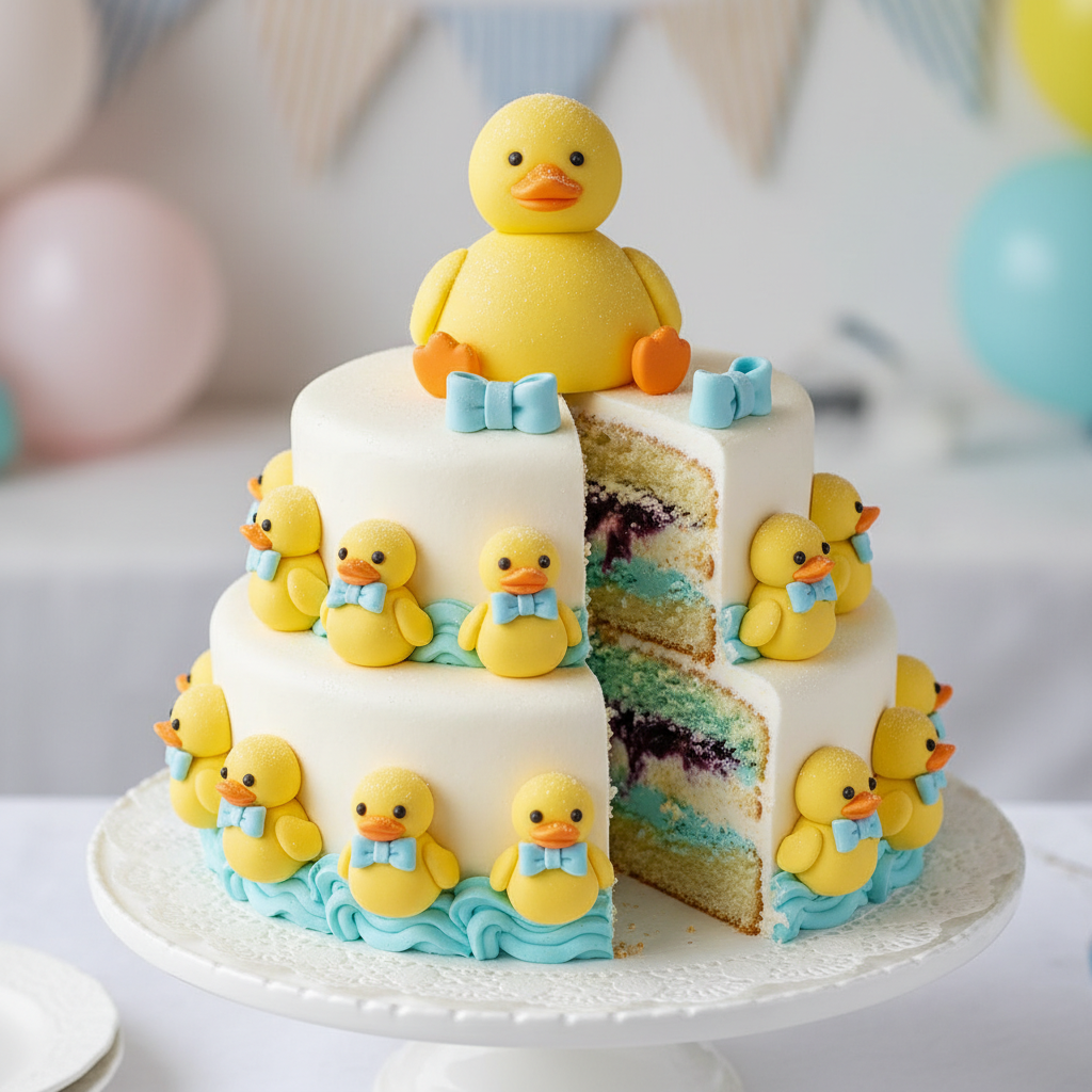 A charming and playful option, this cake features adorable duckling decorations. The inside is a delightful waddle of pink or blue, bringing a smile to everyone’s face.