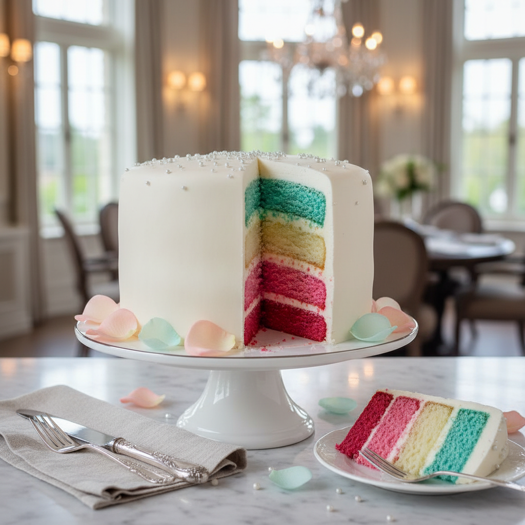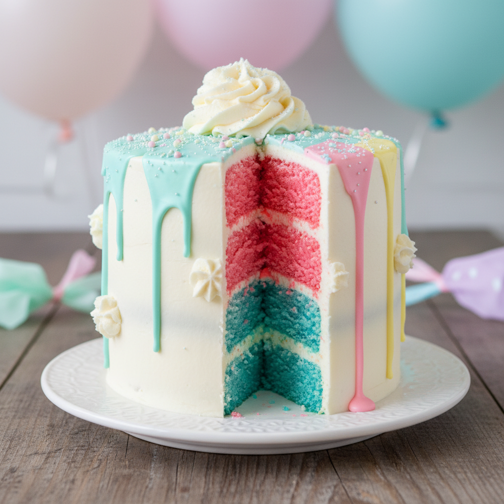 This timeless option features a beautifully frosted exterior, typically white or neutral, that gives no hint of what’s inside. When cut, the cake reveals layers of sponge cake gradually transitioning from light to dark pink or blue. It’s subtle, sophisticated, and always a crowd-pleaser.