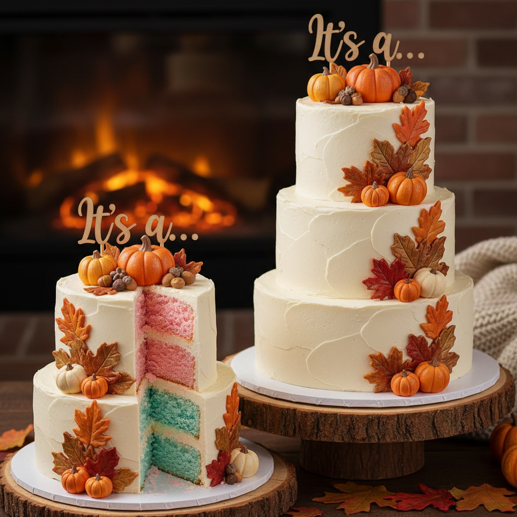 If your reveal is in autumn, a ‘Little Pumpkin’ cake is perfect. Adorned with fall foliage and miniature pumpkins, the cake hides a warm pink or blue interior, celebrating the season.