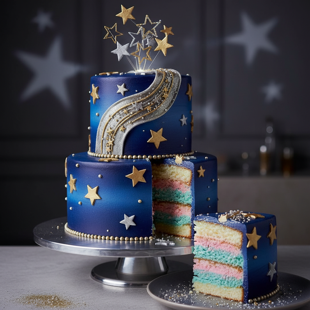 Embrace a celestial theme with a cake decorated with stars, moons, and glitter. The inside reveals the gender with a dreamy pink or blue hue, perfect for a whimsical and magical reveal.