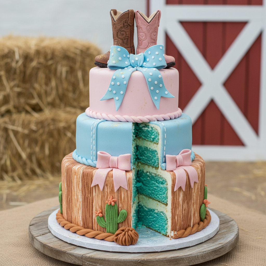 For a rustic or country-themed party, a ‘Boots or Bows’ cake is ideal. Decorated with cowboy boots and delicate bows, the cake’s interior holds the gender secret.