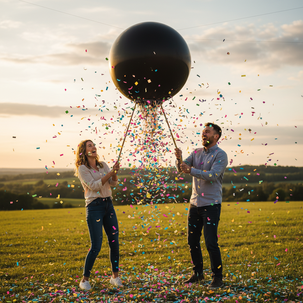 Fill a single black balloon with pink or blue confetti. You and your partner can take turns poking it with a pin until it pops, showering you with the exciting news.