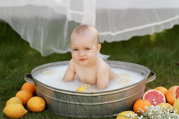 Try a cute milk bath or fruit bath setup — think warm water, floating flower petals, or sliced citrus. It’s safe, aesthetic, and super photogenic.