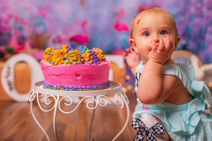 A baby-safe “half cake” with whipped cream or fruit puree makes for the perfect messy, joyful photo moment. Keep it soft and colorful for sweet giggles.
