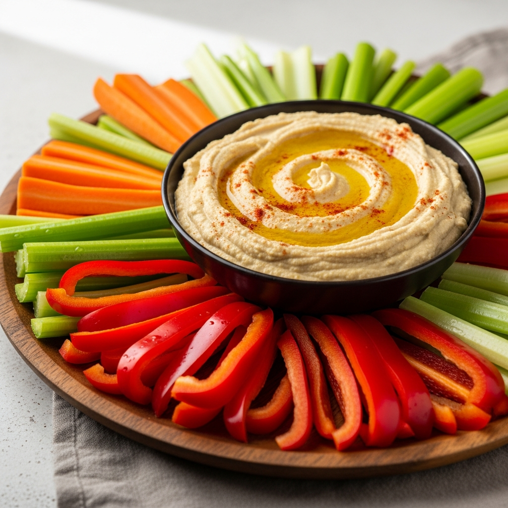 Hummus is packed with plant-based protein and fiber. Serving it alongside colorful strips of bell peppers, cucumbers, and carrots encourages vegetable consumption. The creamy texture of the chickpeas makes for a satisfying dip.