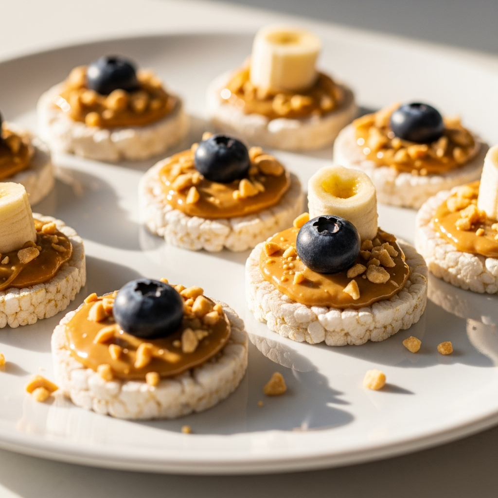 Mini rice cakes are low-mess because they do not shatter as easily as large ones. Applying a very thin layer of almond or peanut butter provides healthy fats while acting as a glue for the rice cake, preventing stray pieces from scattering.