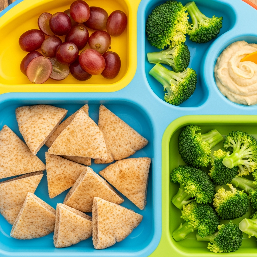 Whole wheat pita bread is sturdy and does not produce many crumbs compared to traditional white bread. Cutting them into small triangles allows toddlers to practice their pincer grasp without the bread falling apart or creating a mess.