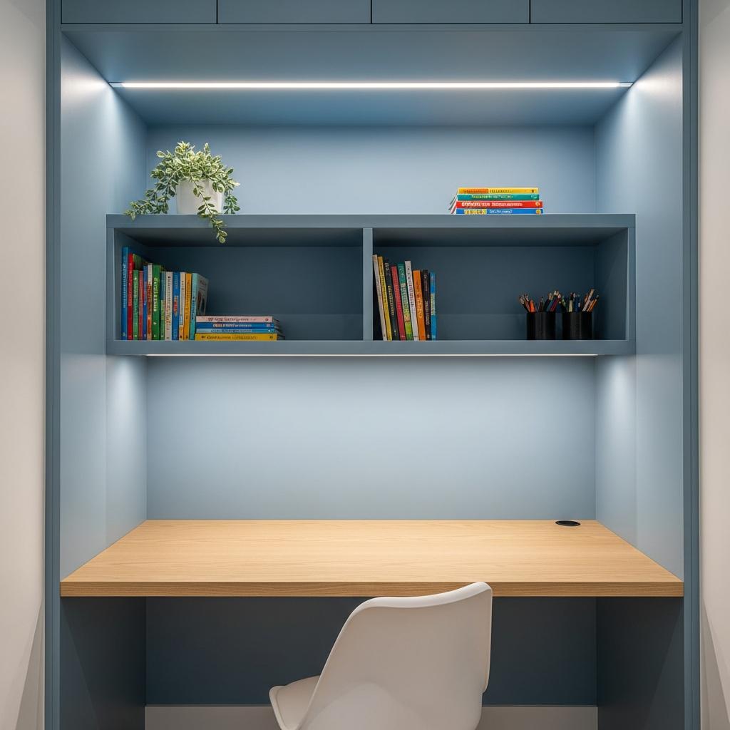 Transform an underutilized reach-in closet into a functional study nook by removing the doors and installing a custom-fit desktop. This approach keeps the workspace tucked away from the main flow of the room while providing a cozy, enclosed environment that helps children concentrate on their tasks.