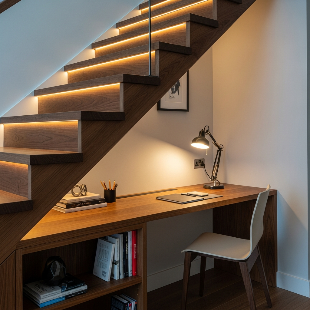 The often-wasted space under a staircase can be turned into a quiet, architectural study zone. Custom cabinetry or a simple built-in desk can make this awkward nook one of the most efficient and secluded spots in the house for reading and writing.