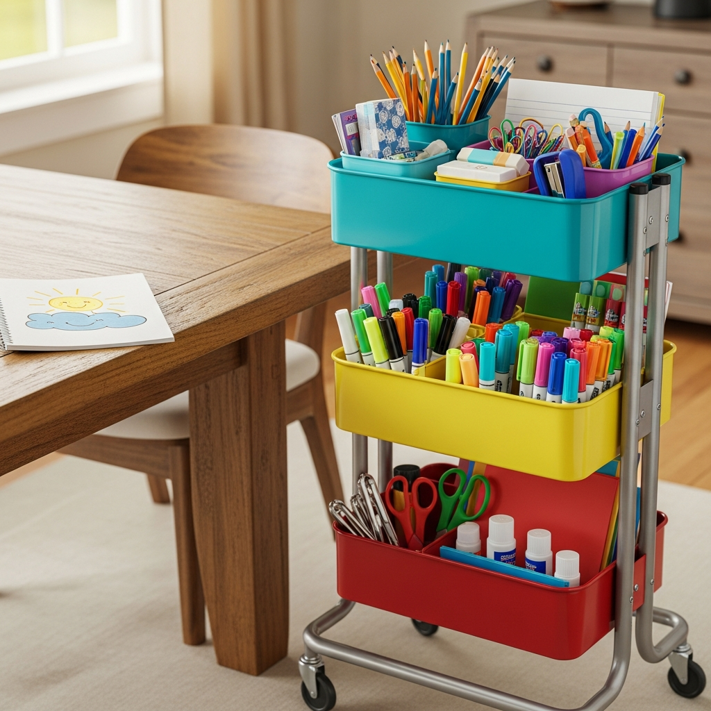 For families who prefer to do homework at the kitchen table, a mobile supply cart is a game changer. Use a three-tiered rolling cart to organize pencils, paper, calculators, and art supplies, allowing the station to be moved wherever the child feels most productive.
