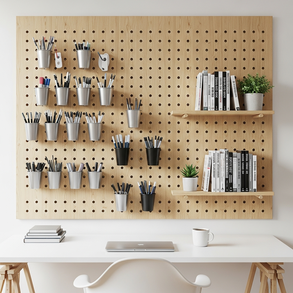 A floor-to-ceiling pegboard allows for complete customization of storage. You can move shelves, hooks, and bins as your child grows, ensuring that their most-used supplies are always within reach while keeping the desktop clutter-free.