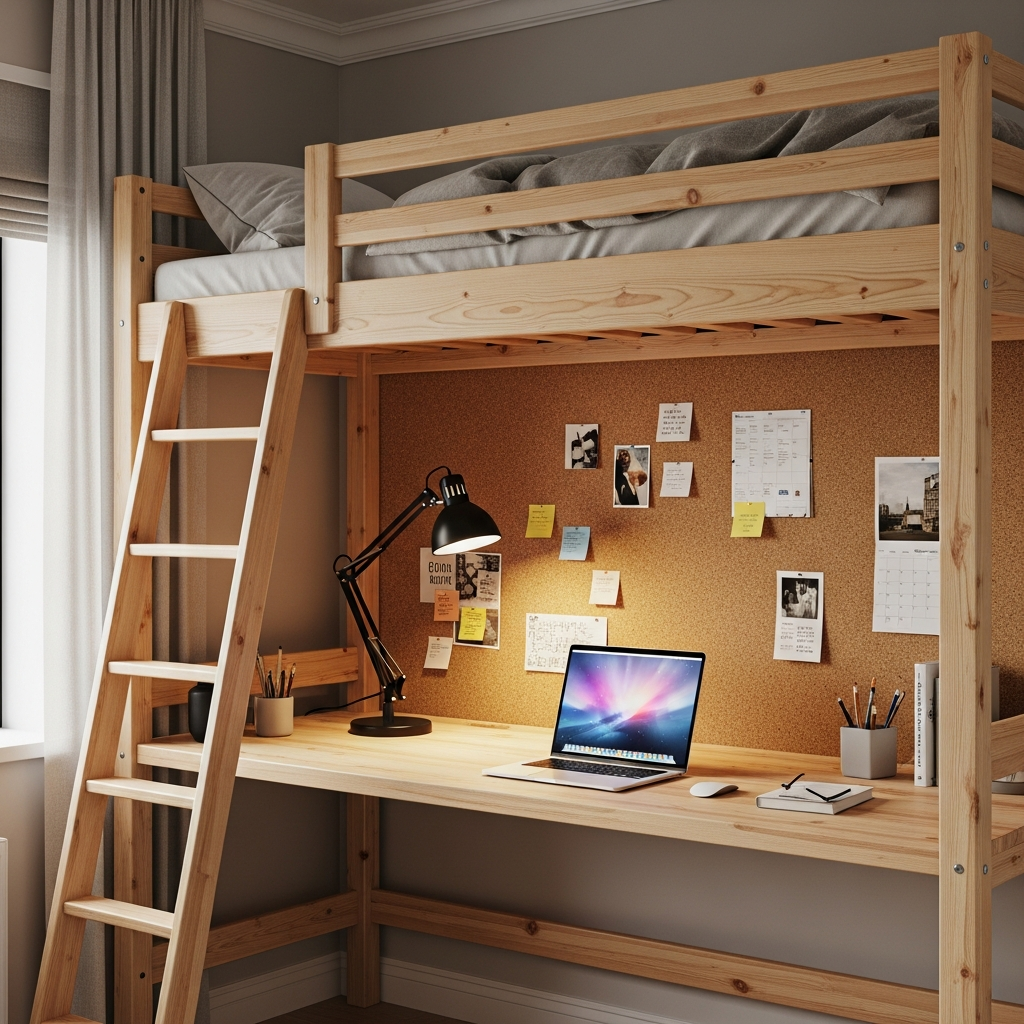 In smaller bedrooms, utilizing the vertical space under a loft bed is a brilliant way to incorporate a desk without sacrificing floor space. This setup creates a private ‘command center’ for older children and teenagers who need extra room for laptops and textbooks.