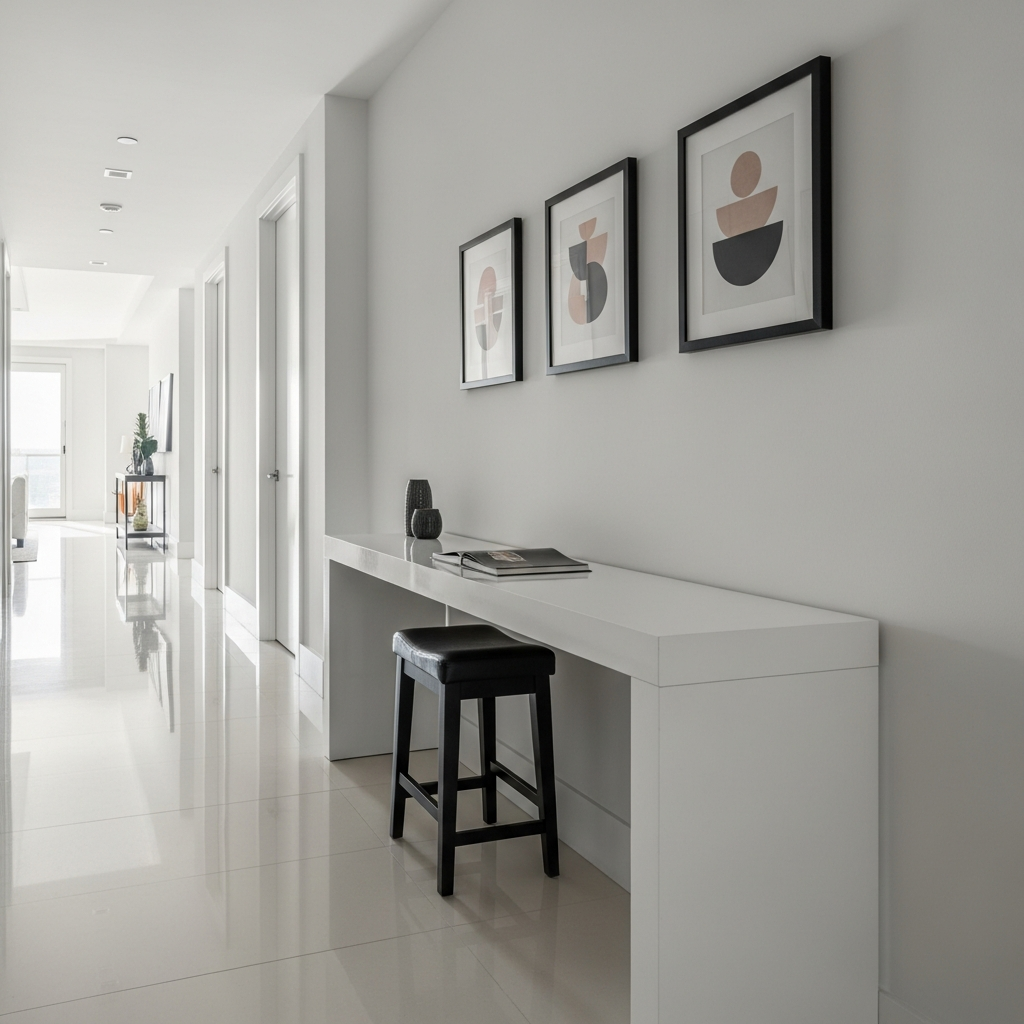 Wide hallways can be the perfect location for a minimalist desk setup. By keeping the furniture slim and the decor neutral, you can create a functional zone that doesn’t obstruct the flow of traffic through the home.