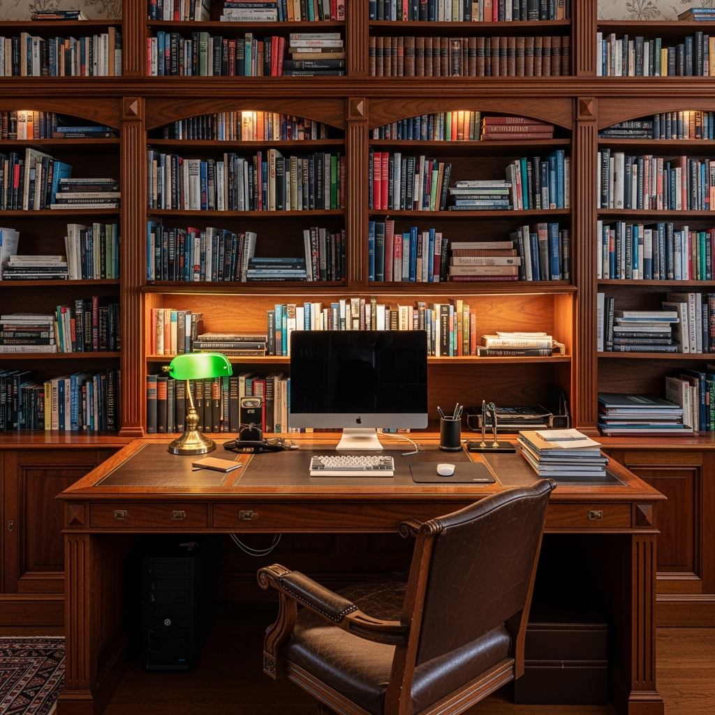 Merge a desk directly into a wall of bookshelves. This provides an academic atmosphere and ensures that reference materials and reading books are always just an arm’s length away, creating a comprehensive home library and study center.