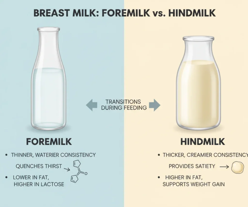 Foremilk is the milk at the beginning of a feed, typically thinner and higher in lactose (milk sugar). It quenches your baby’s thirst and provides initial energy. Hindmilk comes later in the feeding, as the breast becomes emptier. It’s thicker, creamier, and significantly higher in fat.