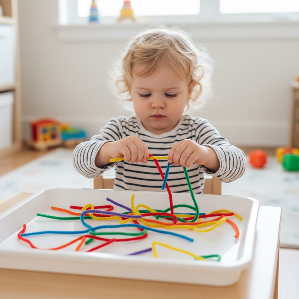 - Connecting and bending: Offer a pile of pipe cleaners and let your toddler bend them, twist them together, or wrap them around their fingers. They can create abstract shapes, stick figures, or even ‘jewelry’.