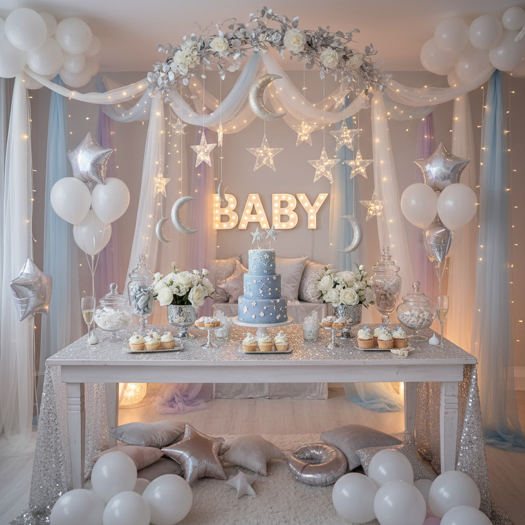 Inspired by the quiet magic of the night sky or fluffy clouds, this theme uses soft blues, grays, whites, and silvers. Delicate star and moon motifs, cloud-shaped decorations, and gentle lighting create a serene, dreamlike atmosphere. It evokes a sense of peace and wonder, perfect for welcoming a little one into a world of gentle dreams.