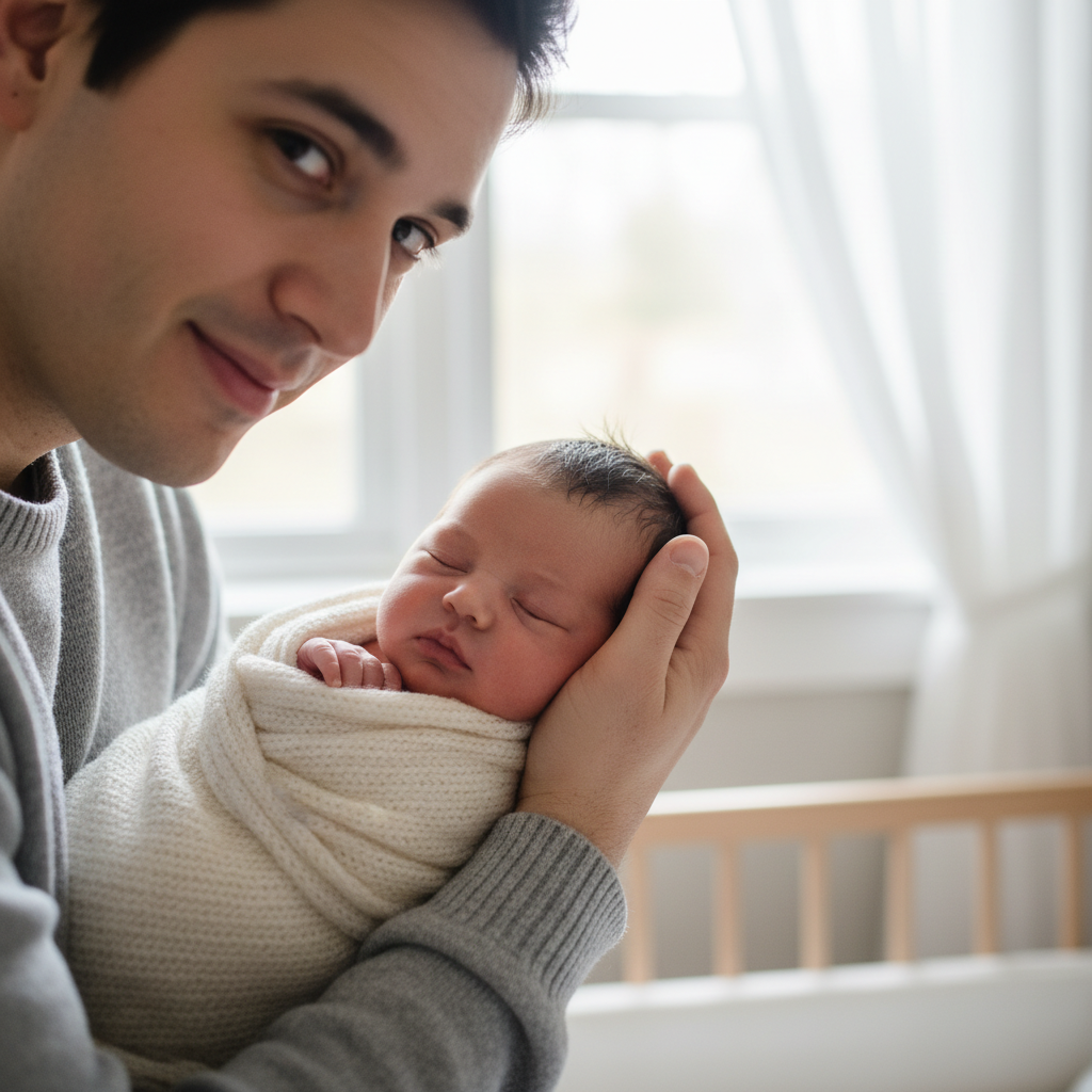 Have one parent gently hold the baby close to their chest, either skin-to-skin or with the baby wrapped in a simple swaddle. Focus on capturing the baby’s tiny head peeking over the parent’s shoulder or the baby nestled into the parent’s neck. The parent’s face can be blurred, or you can focus on the baby’s expression and their connection.