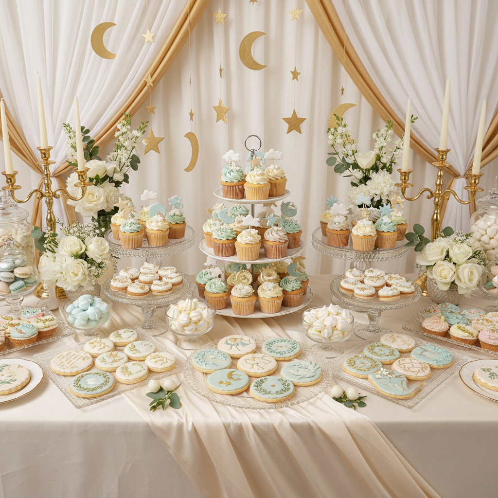 Embrace the magic of the night sky with stars, moons, and constellations. Think soft blues, grays, silvers, and golds. Decorations can include hanging star lanterns, moon phase garlands, and cosmic treats like star-shaped cookies. This theme evokes wonder, dreams, and a sense of calm, perfect for any baby.