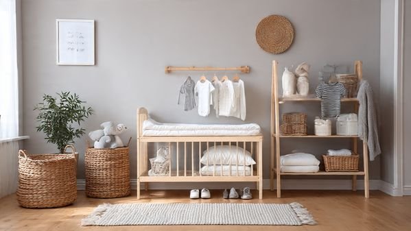 - Storage: You’ll need drawers, bins, or shelves for clothes, diapers, and baby supplies.
