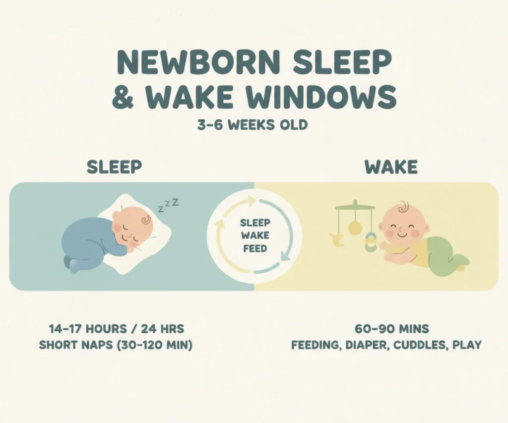 Focus on getting through each feed and sleep cycle. Don’t worry about wake windows yet; just observe your baby for signs of tiredness after they’ve fed.