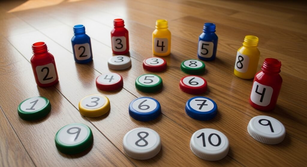 Write numbers on bottle caps and draw matching dots or shapes on bottles.